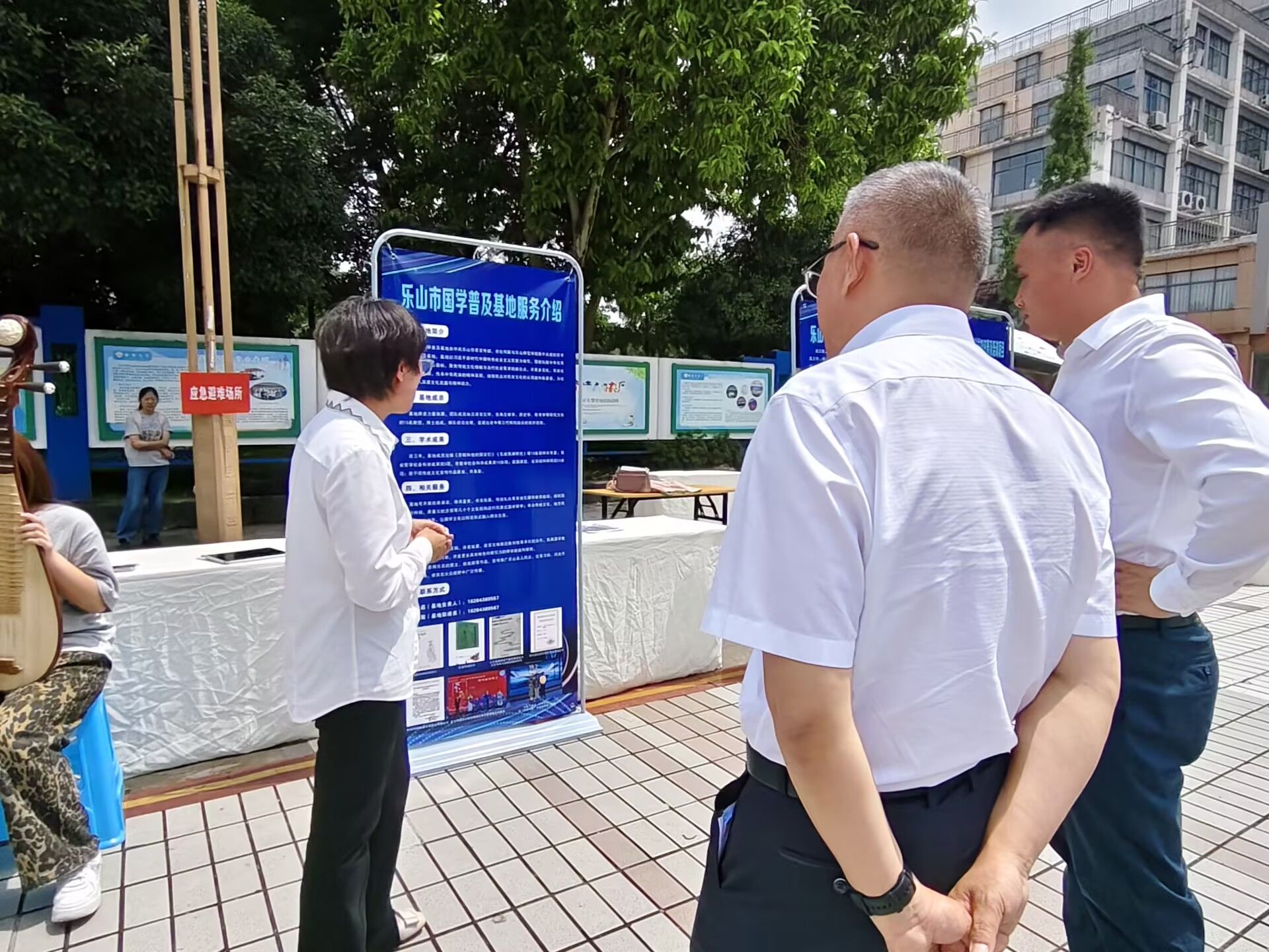 启动仪式后,冯彬一行在江滔的陪同下,现场参观了科普成果展。在乐山市国学普及基地展位前,基地成员郑爱菊向参观领导详细介绍了基地在国学普及与社会服务方面取得的系列成果。她重点汇报了基地如何深入挖掘传统文化资源,通过讲座、体验活动、教材研发、社区服务、乡村文化振兴项目等多种形式,面向学校、社区及广大公众开展国学教育与普及工作,在提升市民人文素养、增强文化自信、促进社会和谐等方面所做的突出贡献。冯彬等领导认真听取了介绍,对基地取得的扎实成果及其在服务地方文化建设、满足公众精神文化需求方面的积极作为给予了充分肯定和认可。