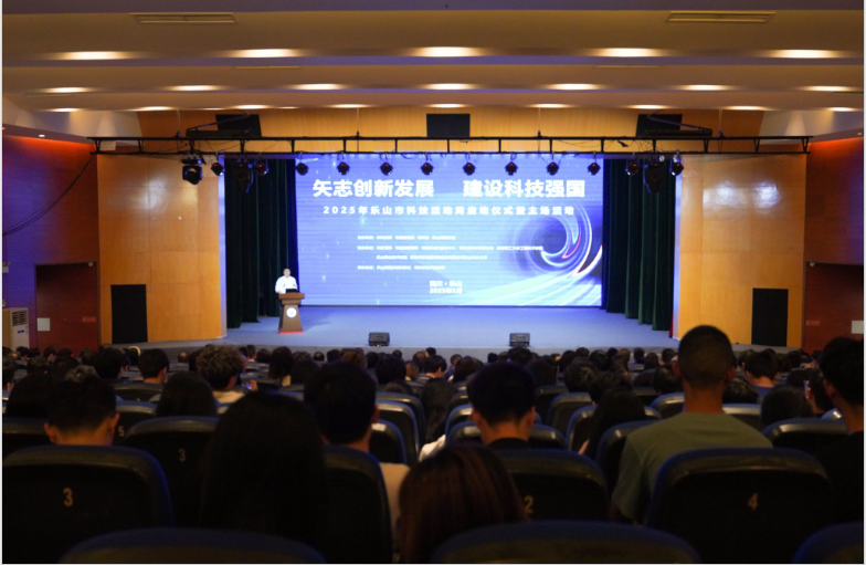 5月28日,2025年乐山市科技活动周启动仪式暨主场活动在乐山师范学院多功能厅顺利举行。乐山市委常委、副市长冯彬,学校党委常委、副校长江滔出席活动并讲话。市委宣传部、市科技局、市科协、市教育局、市应急管理局、市防震减灾服务中心、市社科联分管负责同志;区县科技管理部门、教育部门、科协科普工作负责同志,省科普基地代表;在乐高校的科研创新机构领导、省级科普基地和项目负责人、学生代表;市区中小学科学素质工作负责同志以及相关企业代表等500余人参加了活动。活动由乐山师范学院科研处处长青海银主持。