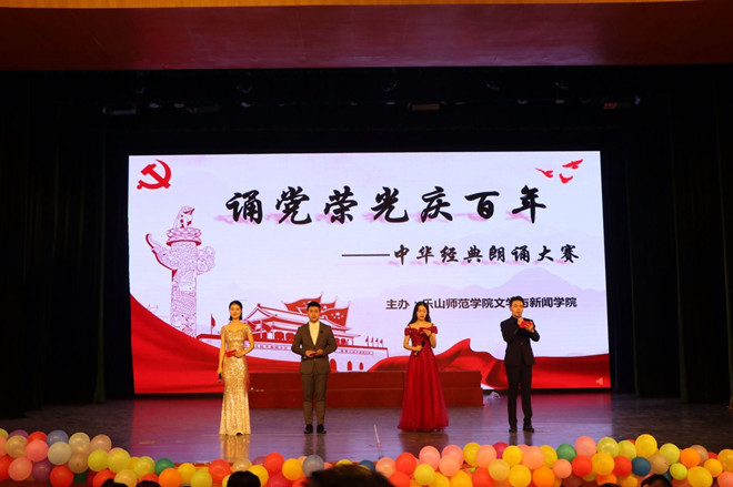 为喜迎建党一百周年,创新大学生党史学习形式,4月8日下午,文学与新闻学院和乐山市国学普及基地在多功能厅举办“颂党荣光庆百年”红色经典朗诵比赛。出席本次比赛的有:胡巍可、穆雪良、李哲浩三位老师并担任专家评委,辅导员资飞、田青,分团委书记蔡光军,以及60名学生组成的大众评审。文新学院2019级、2020级全体班级共18支参赛队伍参加了本次角逐。